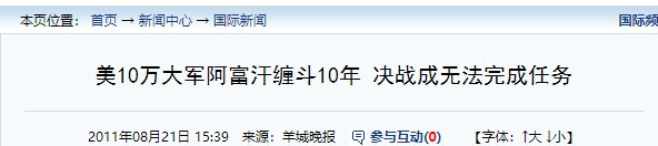 羊城晚报2011年08月21日《美10万大军阿富汗缠斗10年 决战成无法完成任务》